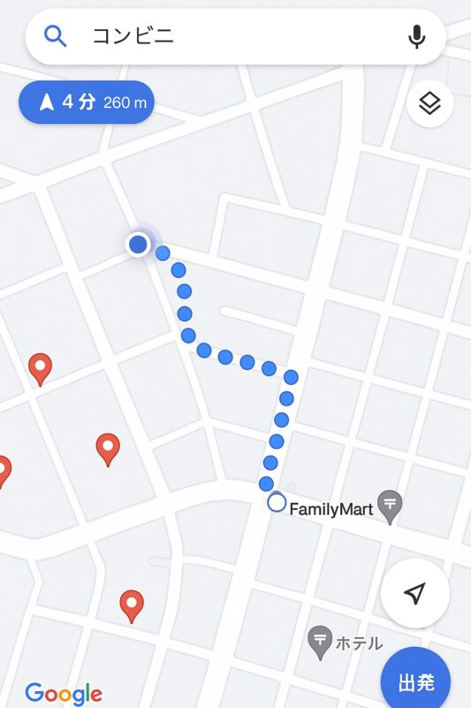 - 数タップで現在地から最寄りコンビニまでのルートが表示される