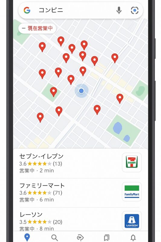 | Google検索 | ブラウザで「近くのコンビニ」と入力 | アプリ不要で誰でも使える、口コミや混雑状況も確認できる | 位置情報を許可しないと正確さが下がる |