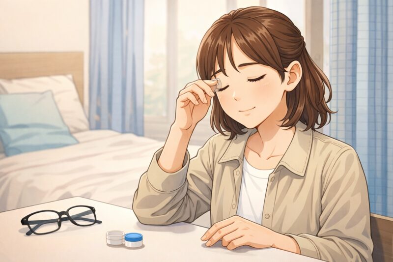 保存液が手元にない場合は、無理に使用を続けず、まずはコンタクトレンズを外すことが基本です。可能であればメガネに切り替えるのが最も安全です。
