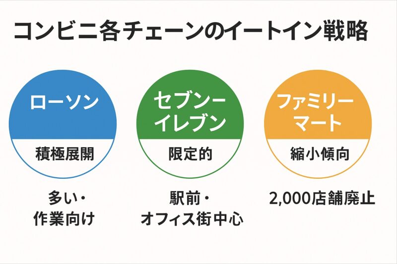 この表からわかるように、各チェーンごとにイートインに対する姿勢が異なります。ローソンは積極的に展開し、セブンは限定的、ファミマは縮小傾向というように、戦略の違いが見えてきます。