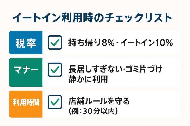- 税率の違い:持ち帰りなら8%、イートインで飲食すると10%。この違いはまだ混乱する人も多く、会計時に間違えないよう注意が必要です。特に「つい座ってしまったが、テイクアウトで精算していた」というケースはトラブルにつながる可能性があります。