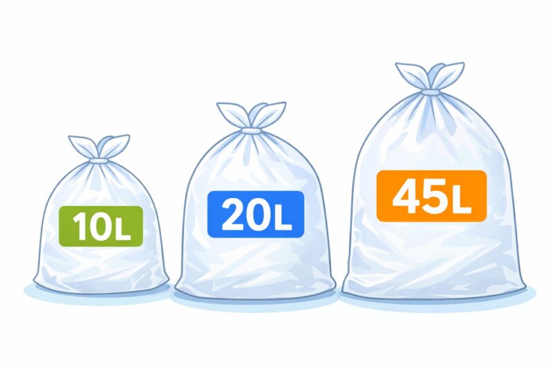 この中でも、45Lは家庭用として最もよく使われるサイズであり、コンビニでも比較的見つけやすい容量です。キッチンのごみ箱や家庭用のごみ袋として使う場合には、このサイズが基準になります。
