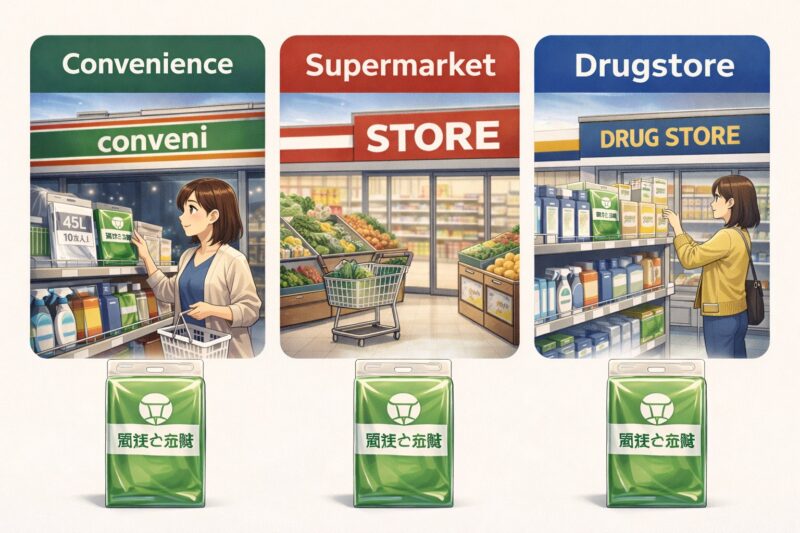 これらの店舗では、自治体指定ごみ袋をレジ横や日用品コーナーに置いていることがあります。