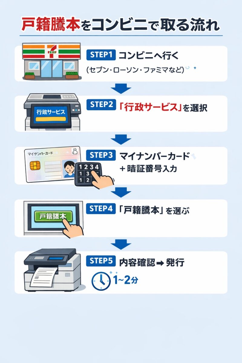 👉 本籍地が遠方でも、全国どこのコンビニからでも戸籍謄本を取得可能