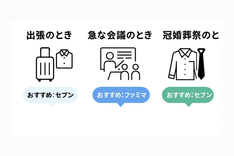 | セブンイレブン | ノーアイロンタイプ、形態安定ワイシャツ、シンプルデザイン | M・L中心、一部LL | 1,500〜2,500円 | 都市部、駅ナカ、空港併設店舗で販売事例あり |