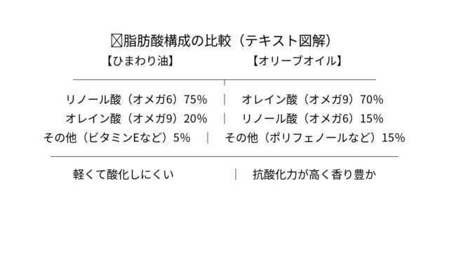 • ひまわり油とオリーブオイルの基本的な違い(成分・風味・加熱性)