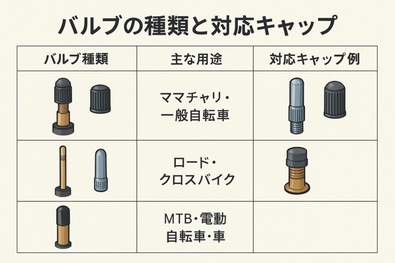 - 物理的なダメージ:キャップがないとバルブ先端がむき出しになり、転倒や物にぶつかったときに曲がったり折れたりしやすい。
