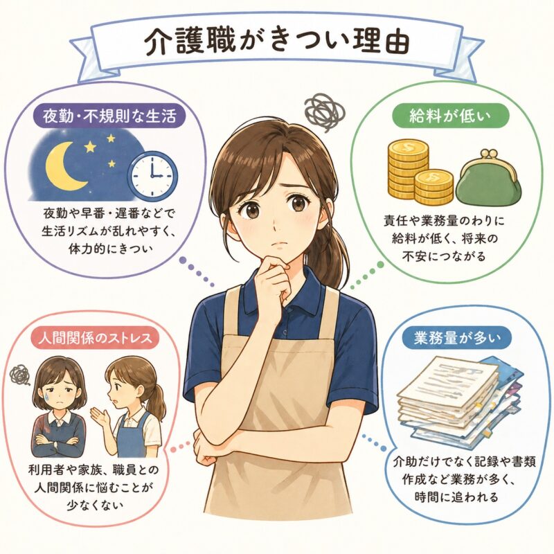 また、夜間は少人数で対応することが多く、急な対応が重なると精神的な負担も増えてしまいます。この点が「きつい」と感じる大きな要因になっています。